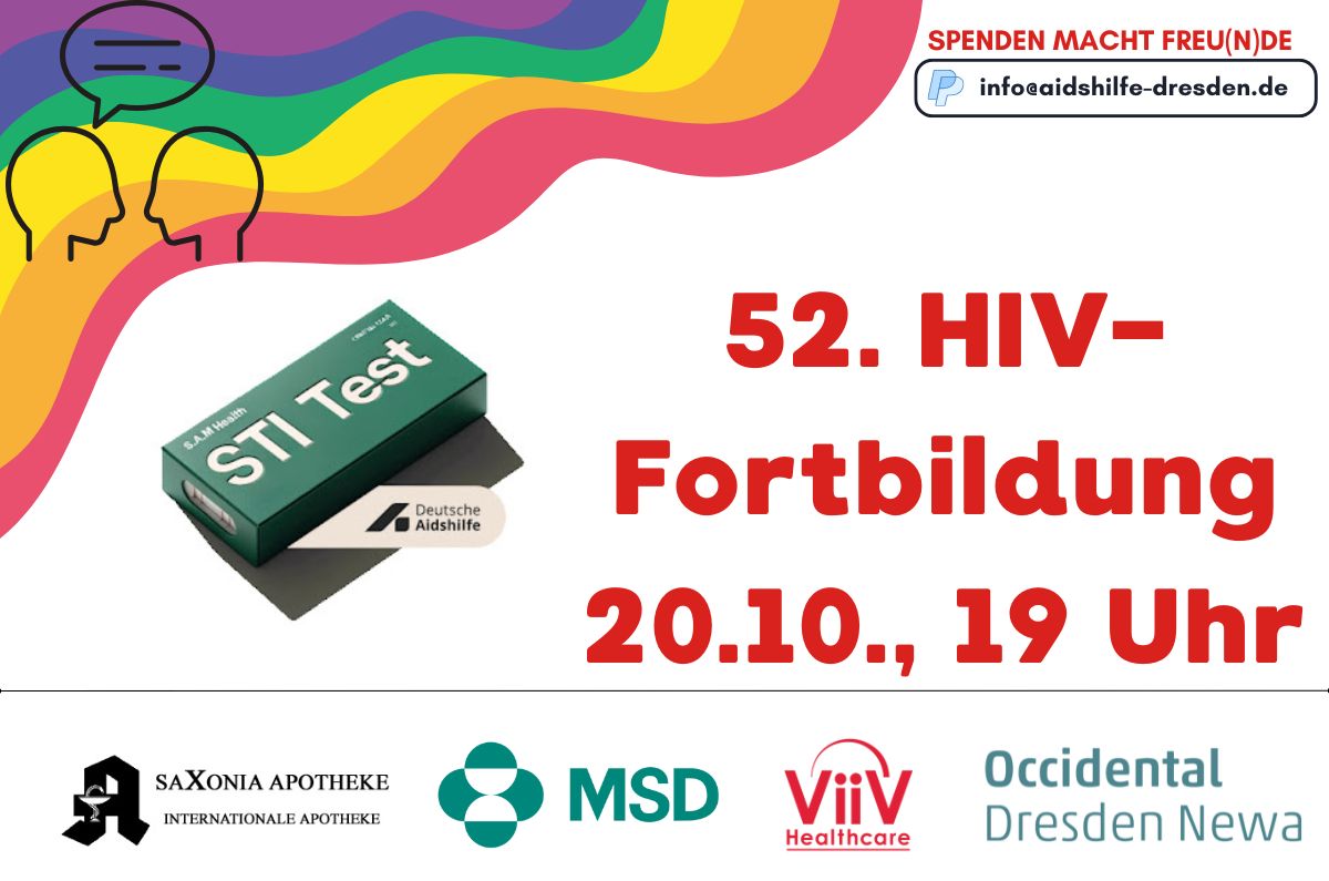 Eine Zertifizierung der Veranstaltung liegt vor, bei Teilnahme sind drei Punkte für das Sächsische Fortbildungsdiplom anrechenbar. Spannende Themen erwarten Sie somit zur 52. HIV-Fortbildung am 20. Oktober 2025 um 19 Uhr. Wir freuen uns auf Sie!