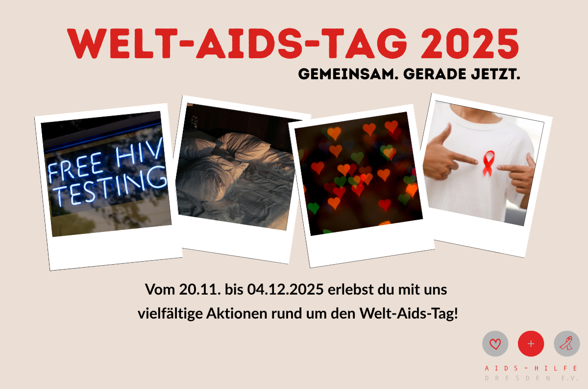 Zum Welt-Aids-Tag am 1. Dezember haben wir zahlreiche Aktionen in den Monaten November und Dezember geplant, bei denen wir uns dem Thema aus verschiedenen Perspektiven widmen. Die genauen Termine finden sich auf der Webseite der Aids-Hilfe Dresden.
